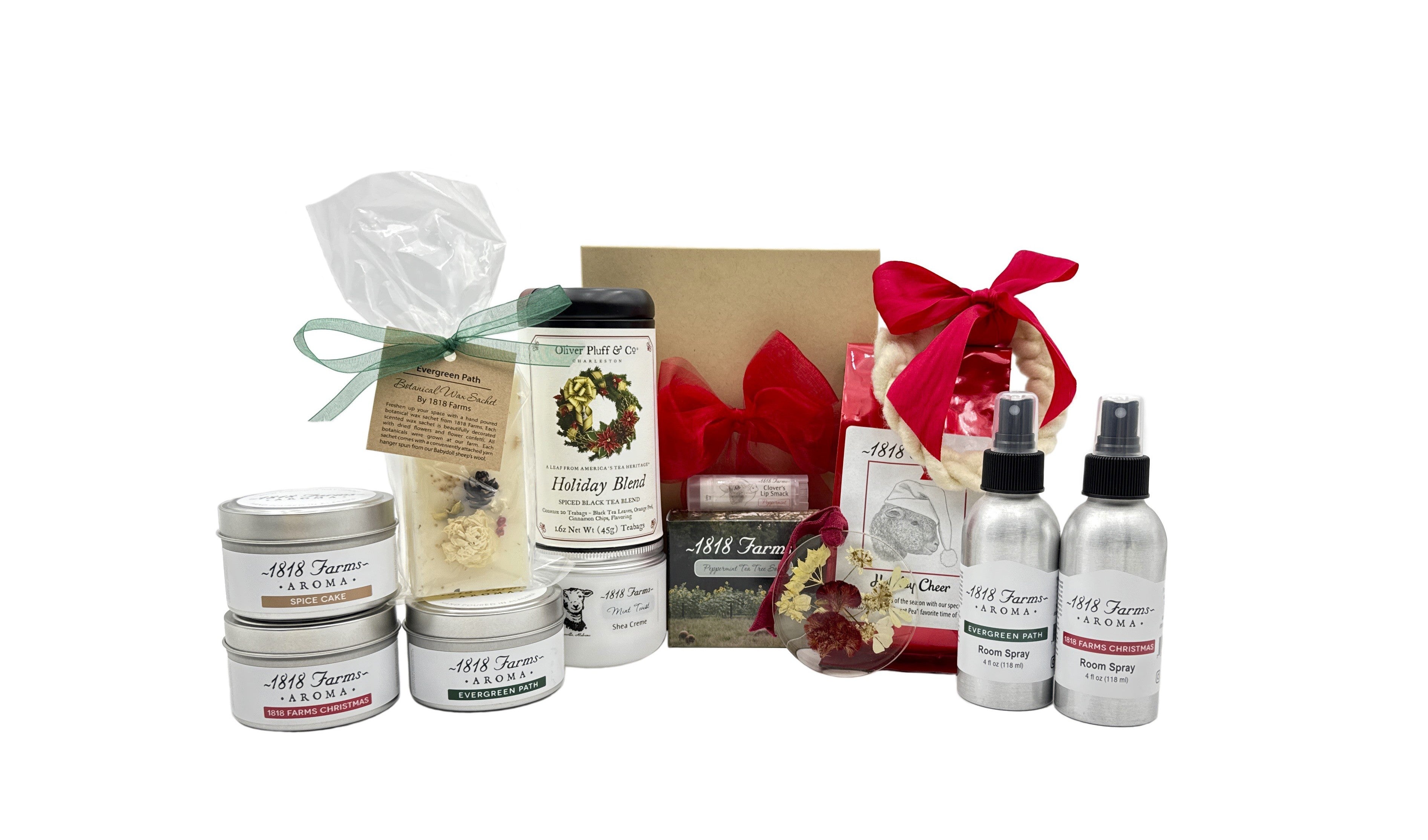 This Holiday Gift Box is full of joy for everyone. Inside, you will find two of our holiday scented candles, 1818 Farms Christmas and Evergreen Path, along with our Evergreen Path Botanical Wax Sachet to welcome the scents of the season. We have also included a unique and limited-edition wreath ornament made from the wool of our Southdown Babydoll sheep, completed with a red silk bow. Warm up with our Holiday Cheer Coffee or the unique Holiday Blend tea by Oliver, Pluff & Co. Lastly, enjoy the festive Chinoiserie Christmas Tree Tea Towel for that perfect kitchen accent.