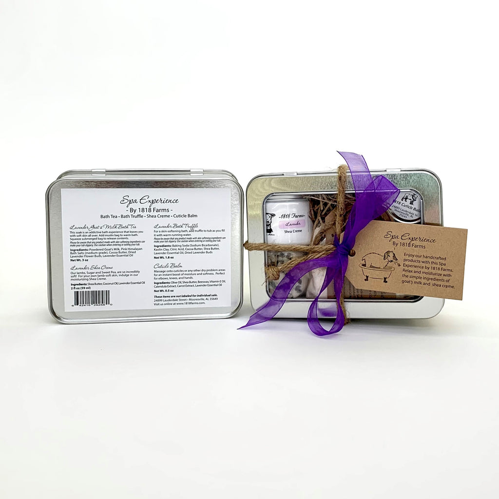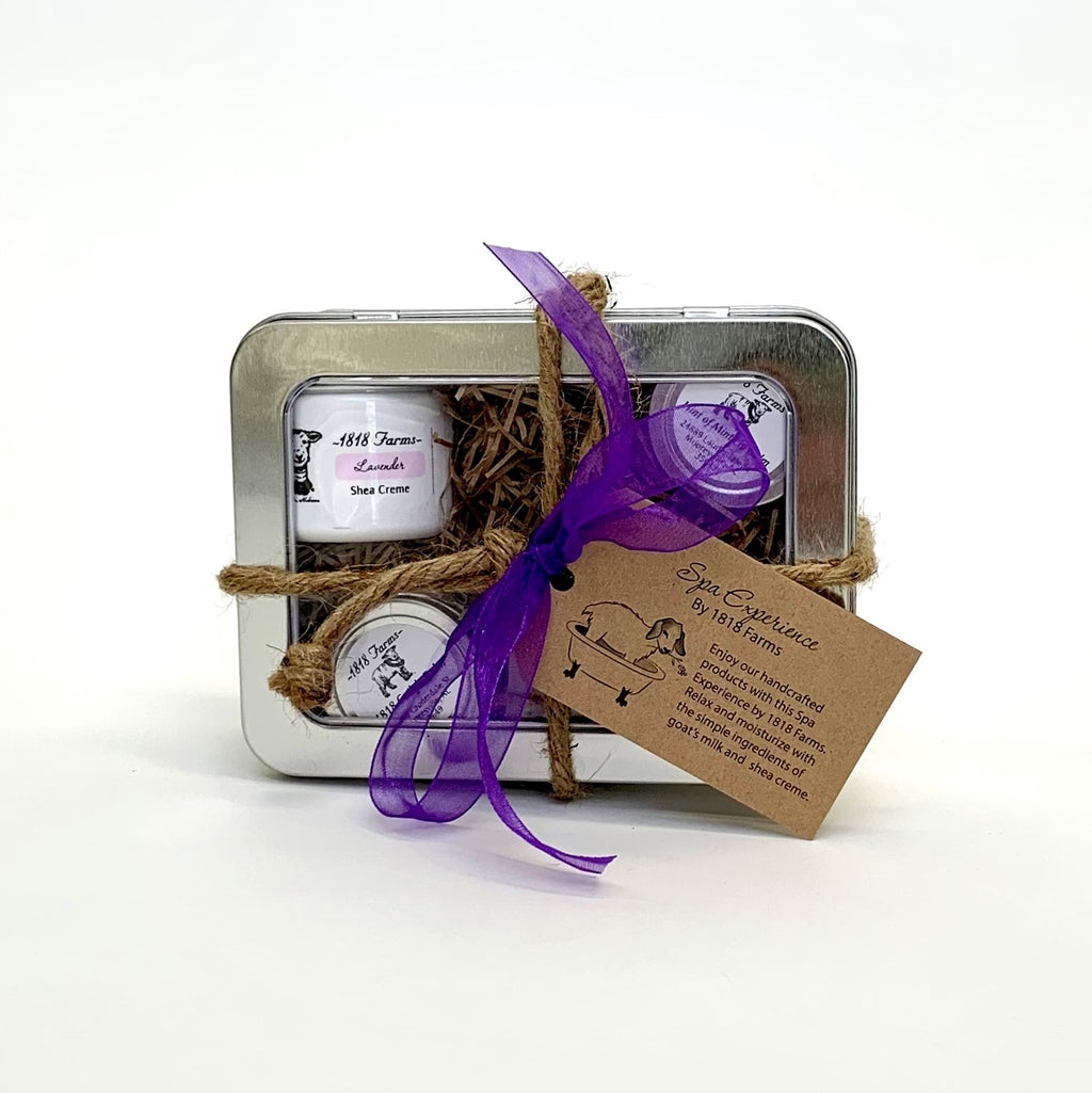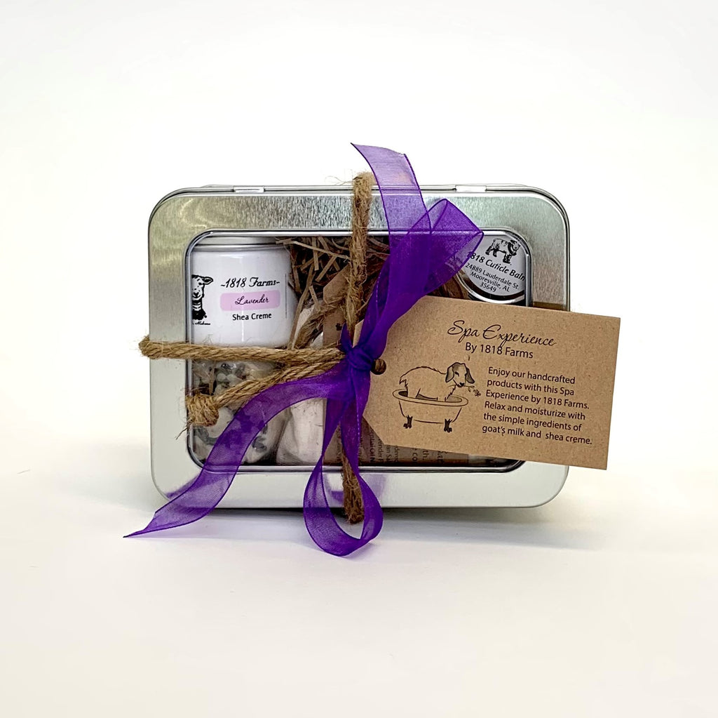 Pamper yourself, or that someone special, with a Spa Experience Tin by 1818 Farms. The hand crafted products included in this "Lavender" tin are made with only the finest, yet simple ingredients such as goat's milk, lavender and Shea butter.