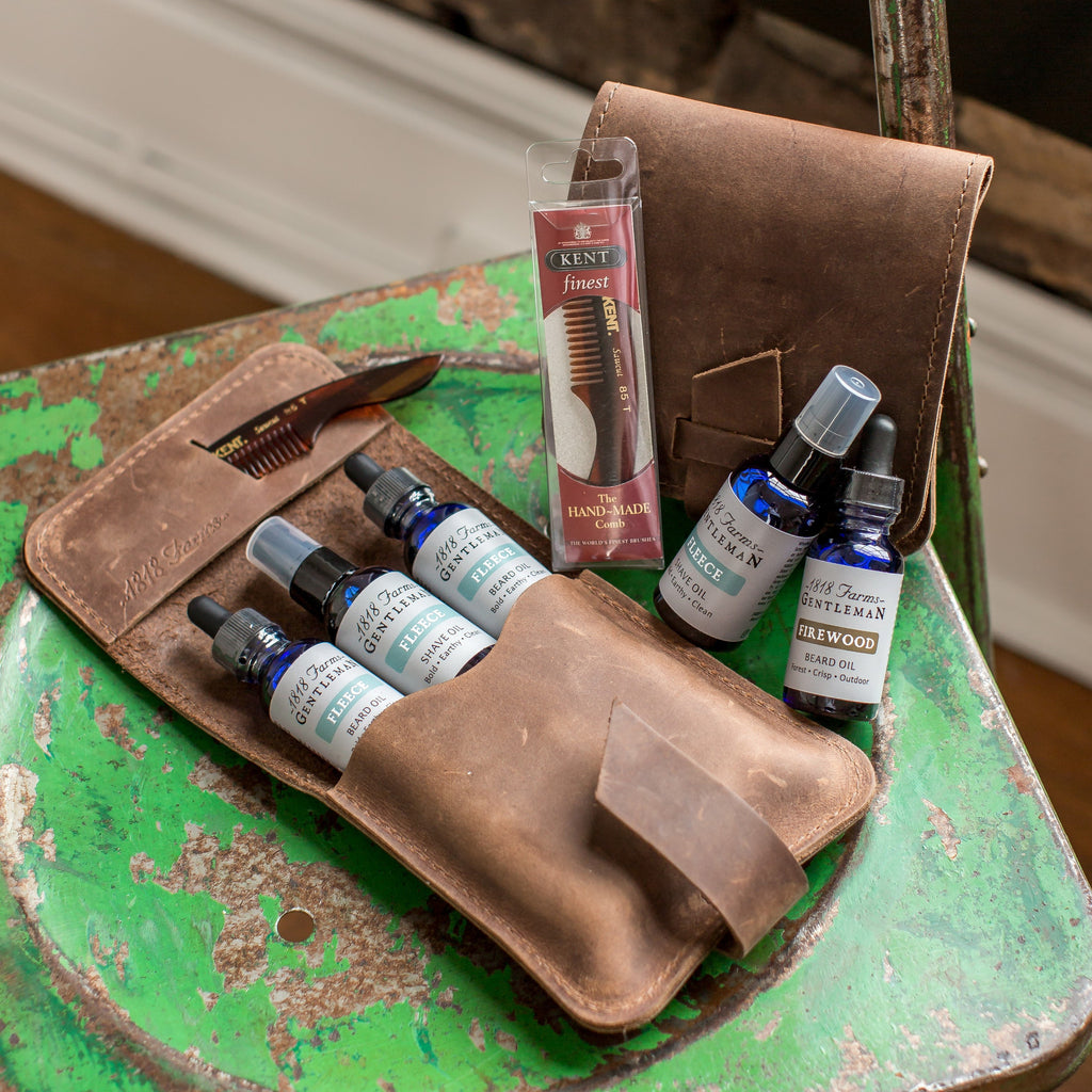 Our 1818 Farms Leather Keeper is a handcrafted lifestyle piece that you will find both useful and beautiful. The Leather Keeper is available in either rustic/dark brown, saddle/polished, or buckskin leather. You will enjoy the simple fold-over design and leather strap. There is a convenient slot for holding items you want to keep within easy reach, such as an 1818 Farms Beard Comb, or razor. The 1818 Farms Leather Keeper will hold up to three of our Shave/Beard oils or our Argan Face Serum, Clover's Lip Smack and Cuticle Balm, or other items. The versatile Leather Keeper can also be used as a clutch or a travel piece.