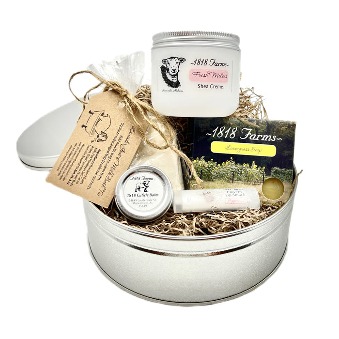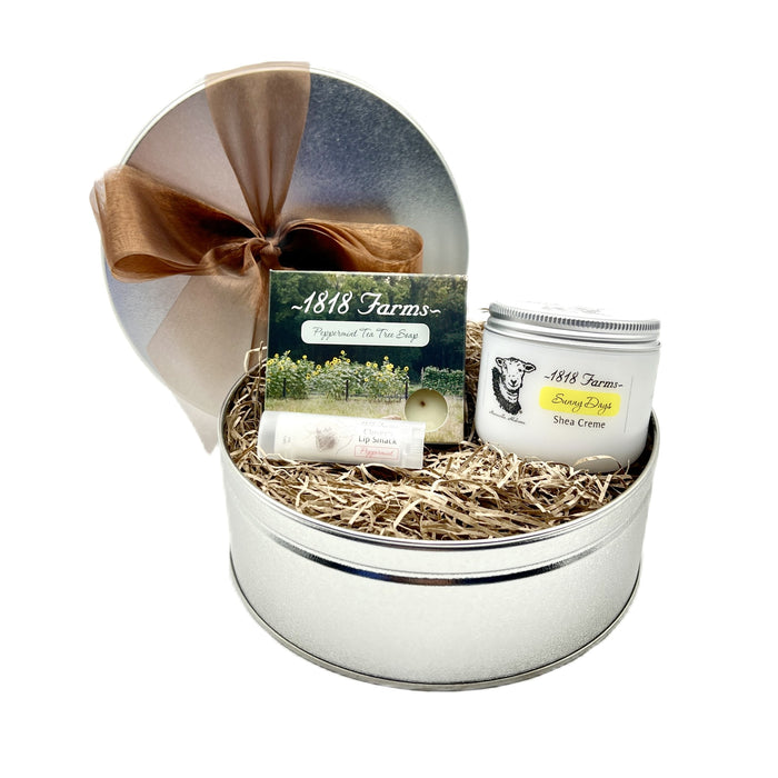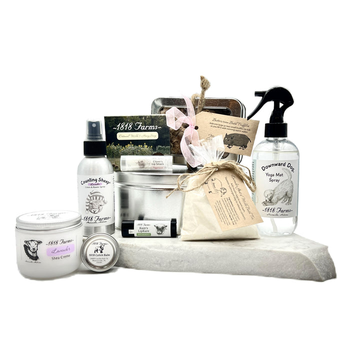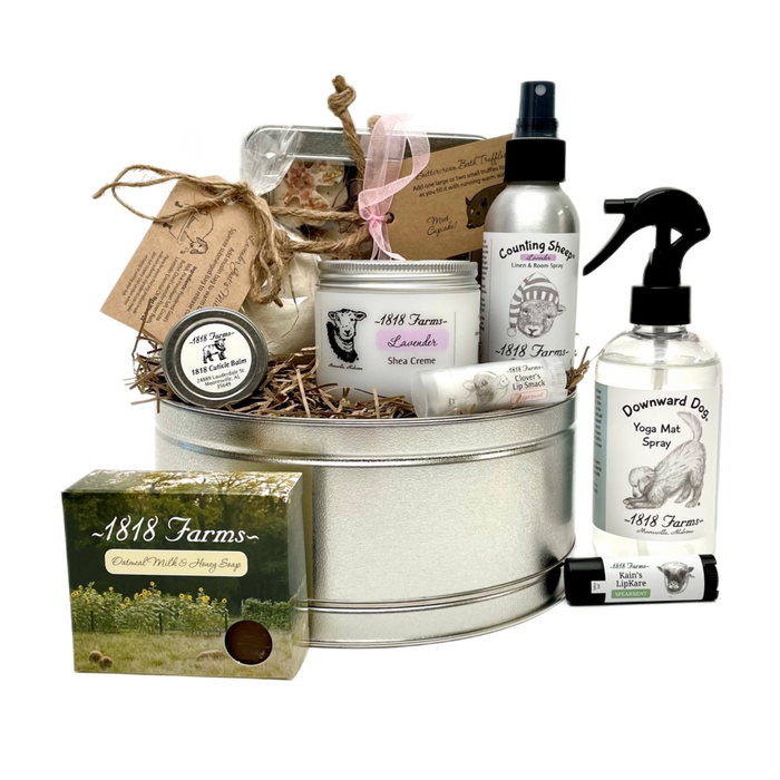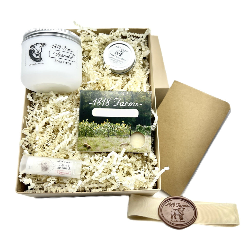 When a loved one is under the weather, here’s a collection that’s sure to bring cheer. Perhaps someone you care about has landed in the hospital or you want to offer good thoughts and a little something to a friend far away. Our Wishing You Well Care Package is the perfect choice for these times! This gift includes our popular handmade personal care items to bring comfort. We have also included a small notebook for jotting down important information, lists and thoughts all in one place. This sturdy keepsake box is finished with a beautiful ribbon and our 1818 Farms wax seal. Let us know and we will include a handwritten note from you.