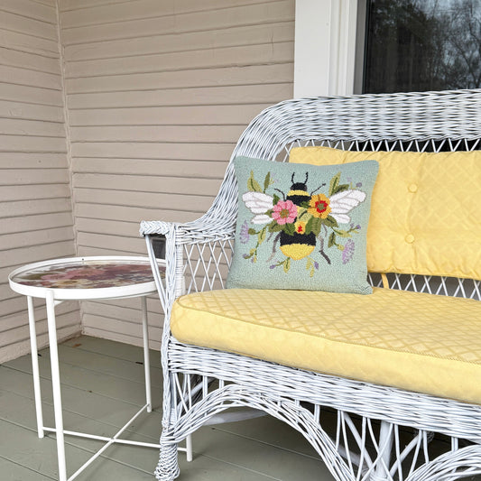 Floral Bee Over Flowers Wool Hooked Pillow