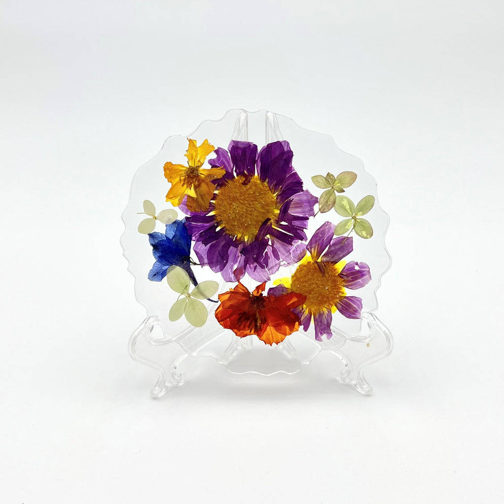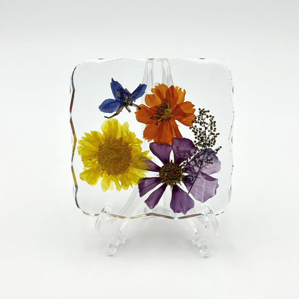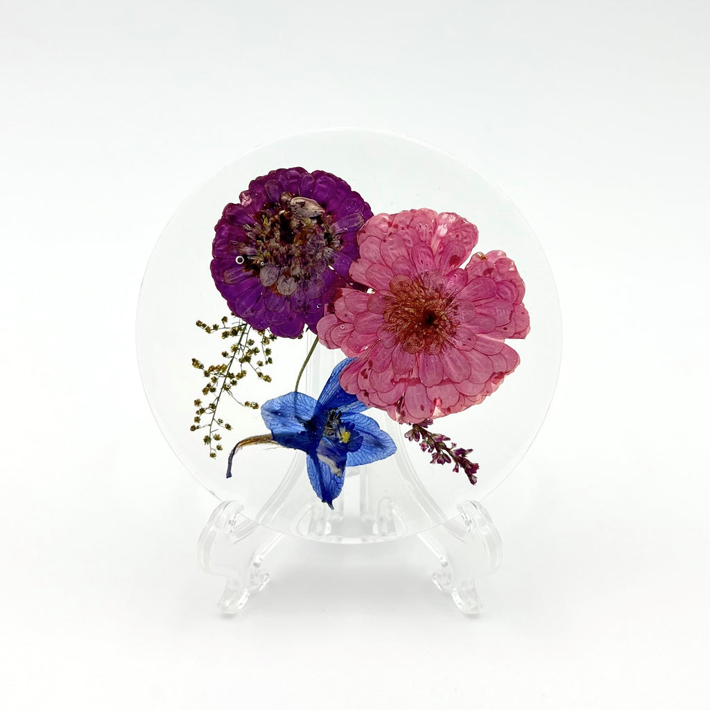 Our farm grown flowers are part of nature. Please embrace the uniqueness of each piece of art. No two pieces will be the same. Some flowers, once cast in resin, may show some translucency. This is a natural occurrence. We hope that you enjoy this piece for years to come.