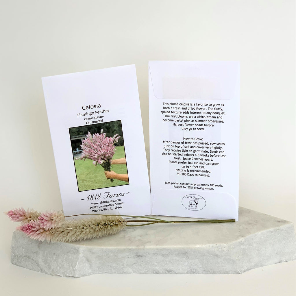 This plume celosia is a favorite to grow as both a fresh and dried flower. The fluffy, spiked texture adds interest to any bouquet. The first blooms are a white/cream and become pastel pink as summer progresses. Harvest flower heads before