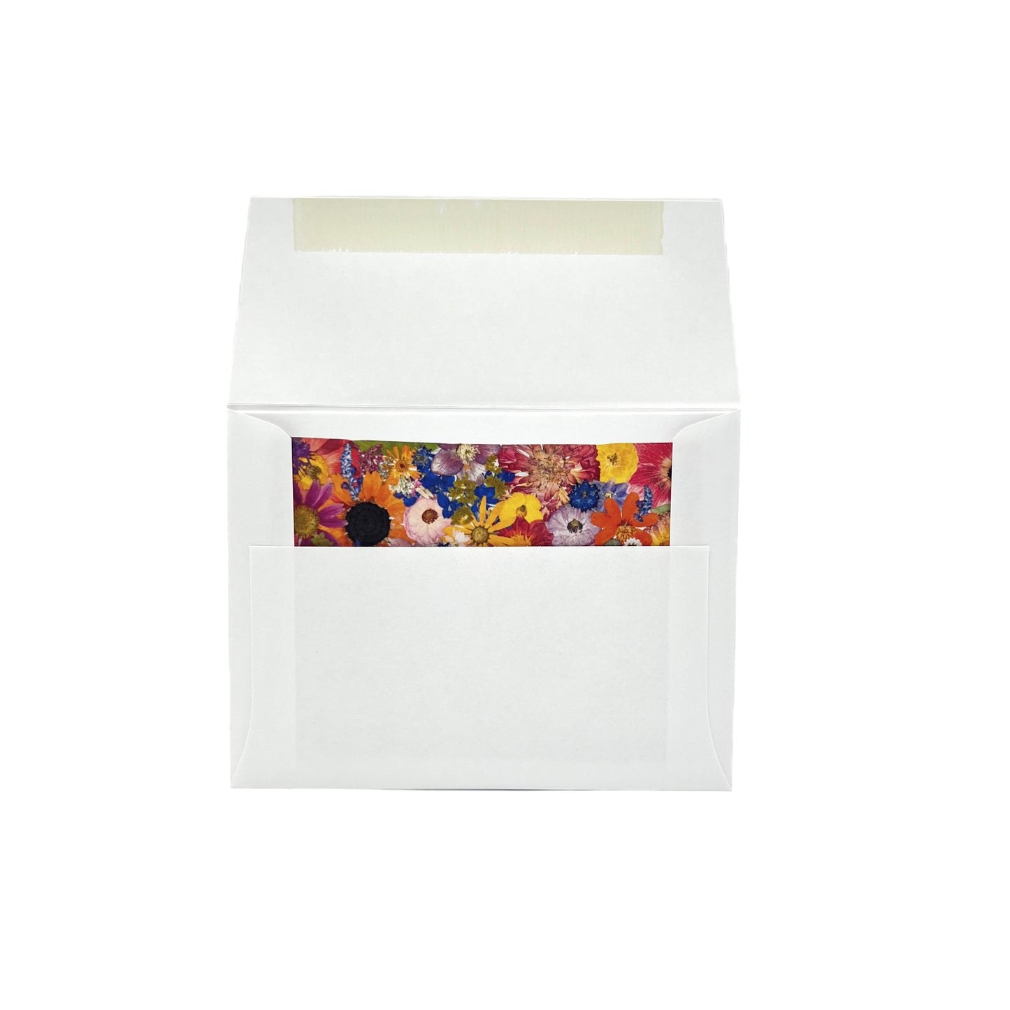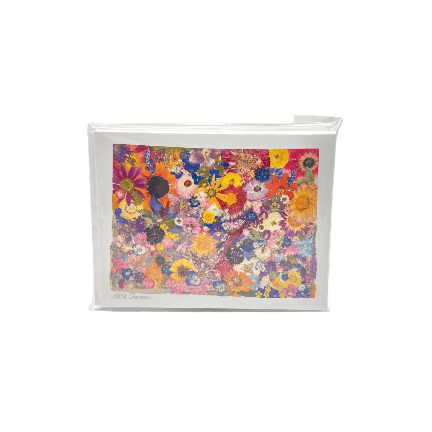 Set of 6 cards with envelopes. Sealed in reclosable crystal clear sleeve. Folded size 4.25” x 5.5”. The notecards are printed in full color using a high resolution image of the original pressed flower state artwork.