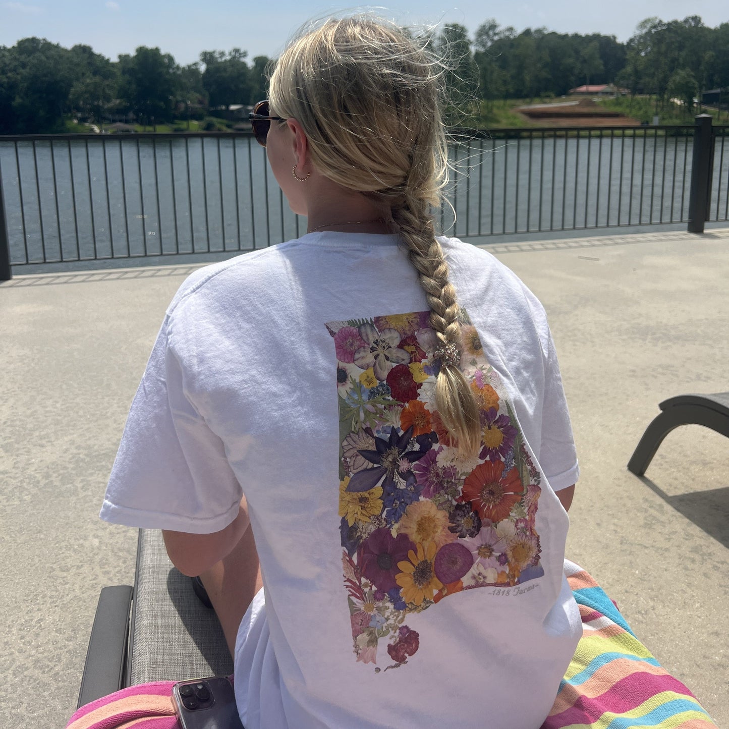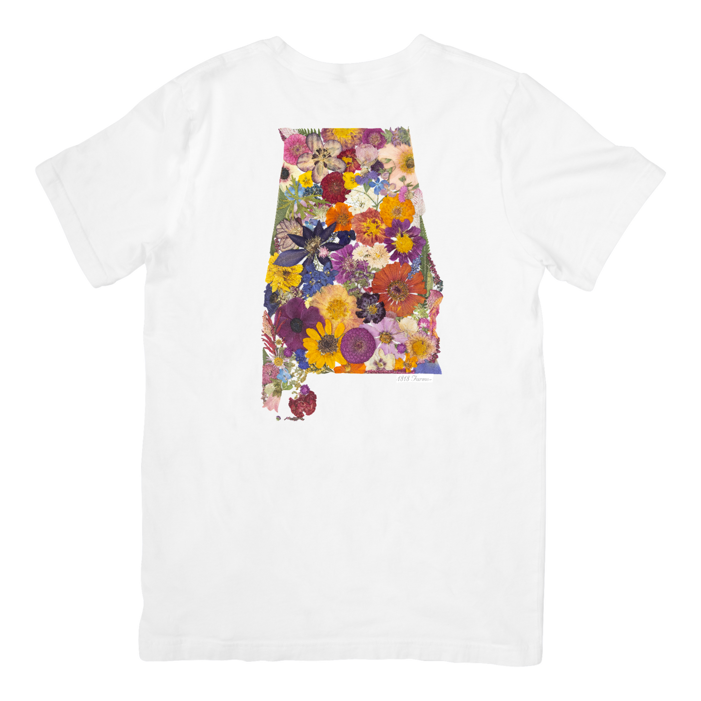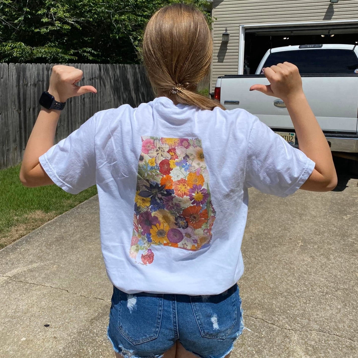 Each shirt features a custom floral original artwork design featuring flowers and foliage grown, harvested, pressed and artfully designed at our family farm in Alabama. The state themed artwork is printed by utilizing the advanced Direct to Fabric (DTF) printing method. This technique ensures vivid colors and intricate details that won't fade or peel over time.