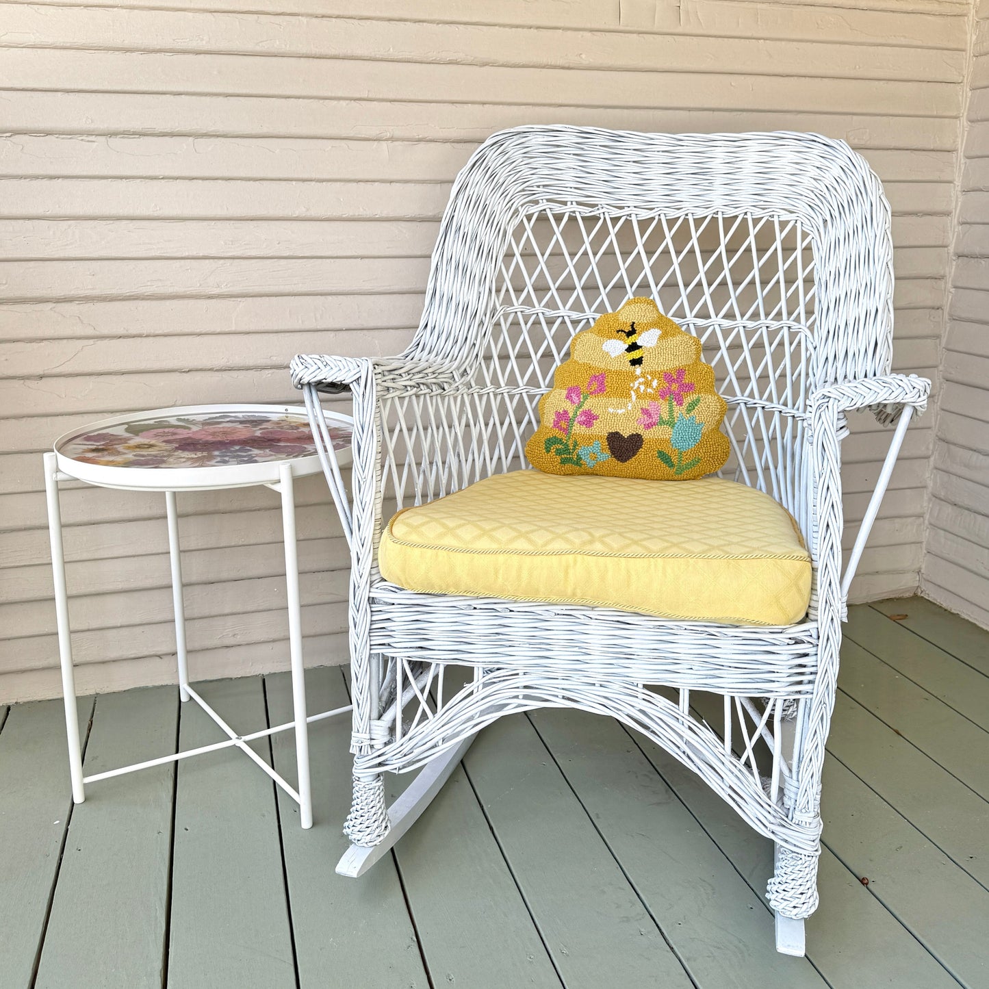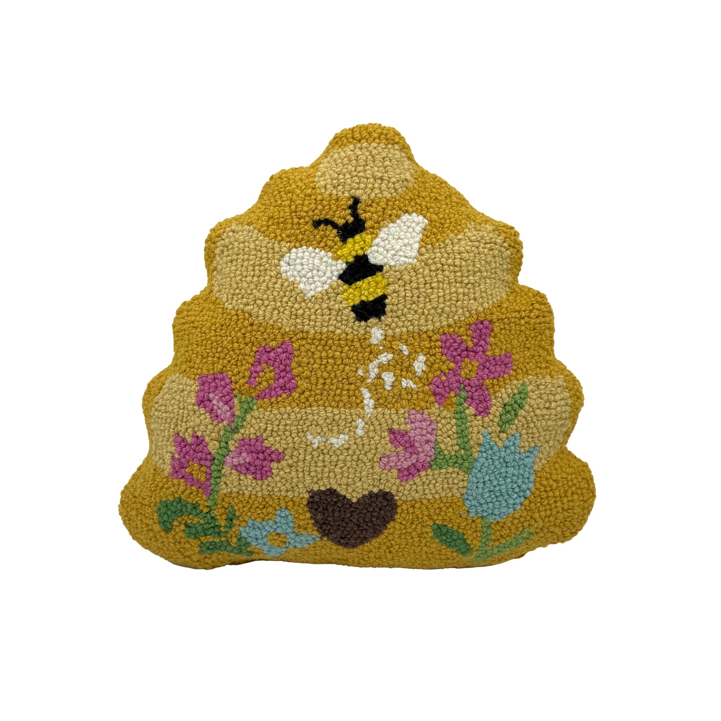 This whimsical bee skep hooked pillow is the perfect accent piece to add in your home. The pillow features a bee with many bright blooms in the shape of a bee skep. The pillow measures 12 inches at its base and 12 inches tall.