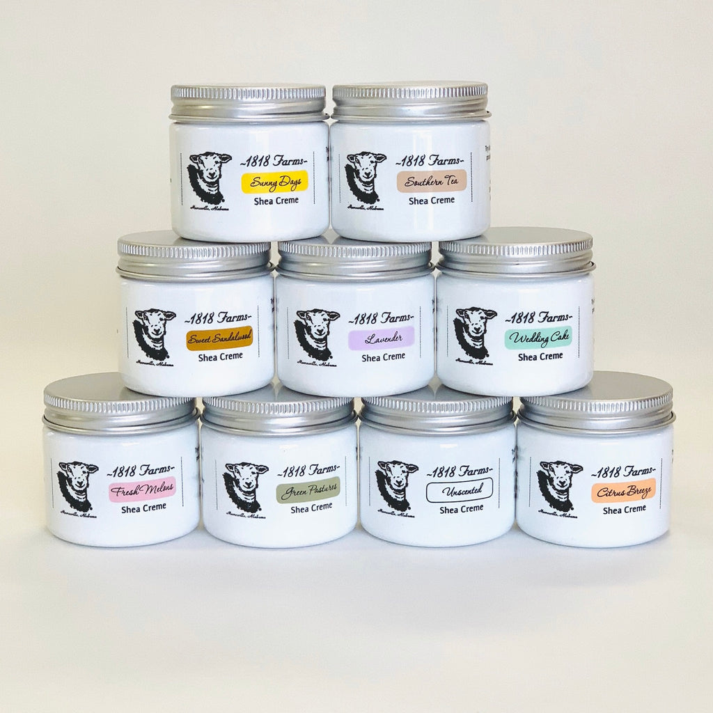 Keep it simple! That was our motto when we developed our Shea Creme Collection. So many lotions and moisturizers are packed full of ingredients that couldn't be pronounced. We made it our mission to create a moisturizer/cream composed of the most basic butters. We wanted a product that we couldn't live without in our daily skincare routine. After many batches and trials we developed just that product - 1818 Farms Shea Creme.