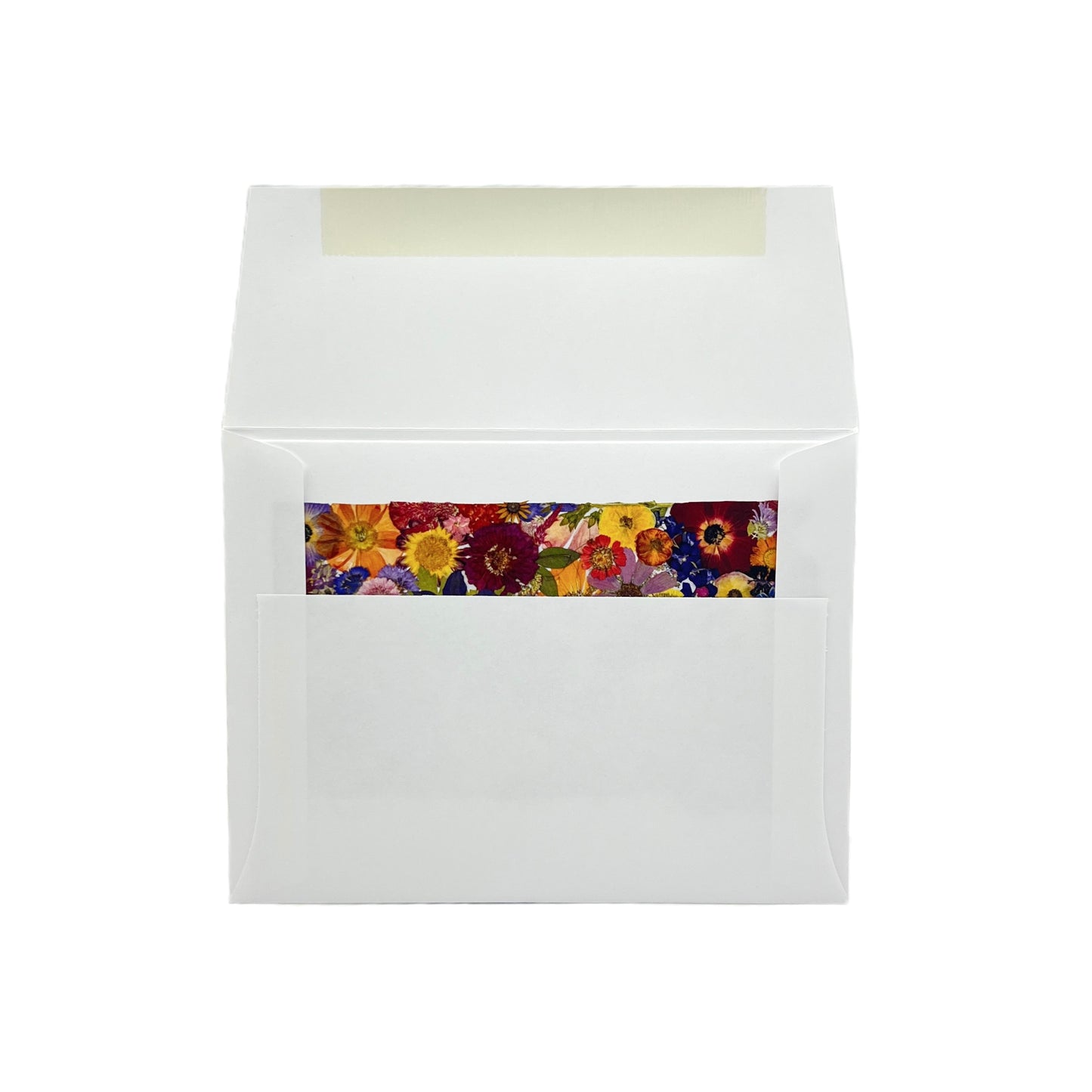 Set of 6 cards with envelopes. Sealed in reclosable crystal clear sleeve. Folded size 4.25” x 5.5”. The notecards are printed in full color using a high resolution image of the original pressed flower state artwork.