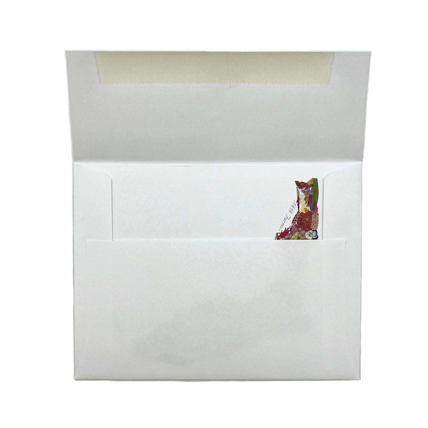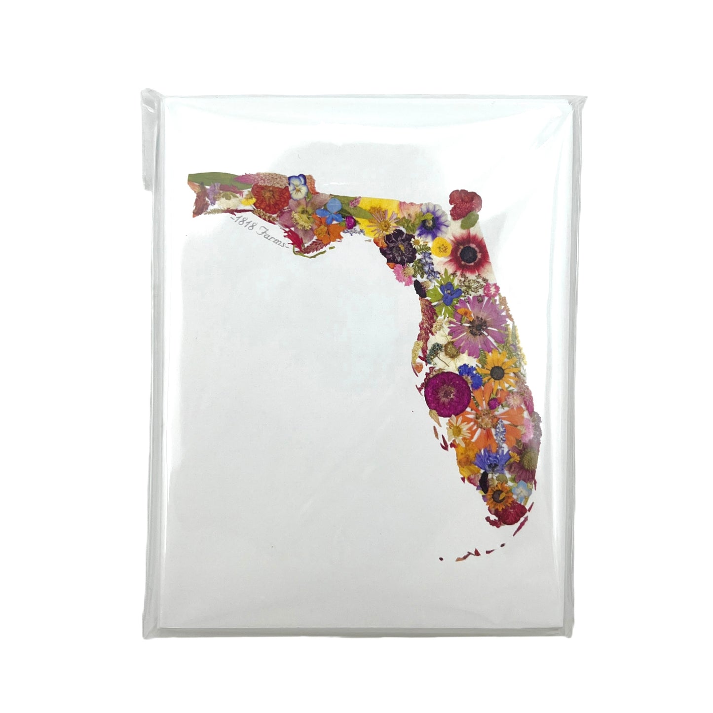 Set of 6 cards with envelopes. Sealed in reclosable crystal clear sleeve. Folded size 4.25” x 5.5”. The notecards are printed in full color using a high resolution image of the original pressed flower state artwork.