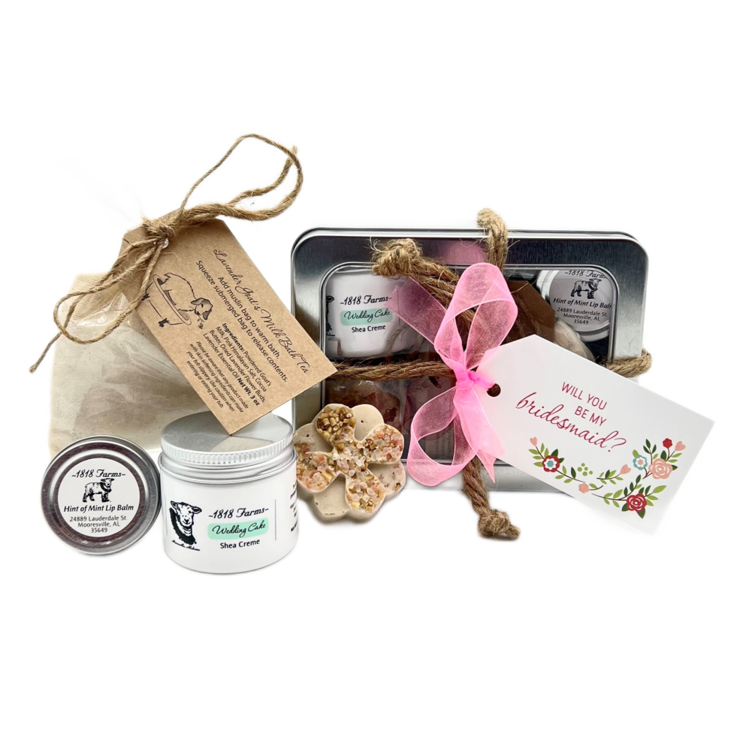 These items are packaged in a metal, clear window container, tied using a rustic rope and finished with a decorative pink ribbon. The gift includes a beautiful “Will You Be My Bridesmaid?” tag. We will happily include a handwritten note if you are shipping the gift set to the recipient.